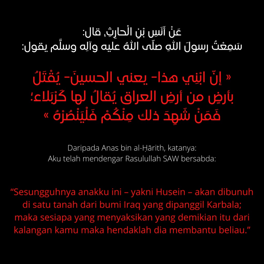 Maksudnya: “Sesungguhnya anakku ini – yakni Husein – akan dibunuh di satu tanah dari bumi Iraq yang dipanggil Karbala; maka sesiapa yang menyaksikan yang demikian itu dari kalangan kamu maka hendaklah dia membantu beliau.”