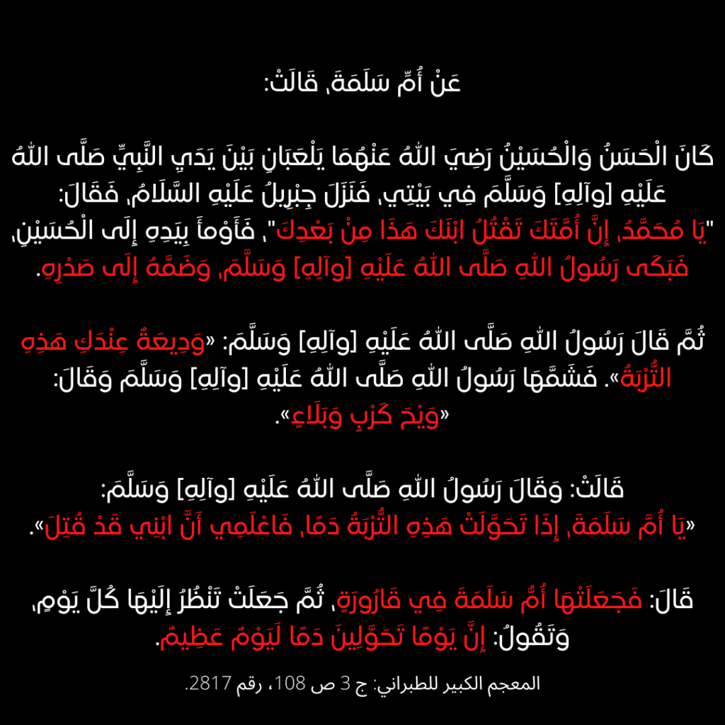 Kata beliau: Dan Rasūlullāh s.a.a.w bersabda: “Wahai Ummu Salamah, apabila tanah ini telah berubah menjadi darah, maka ketahuilah bahawa anakku telah dibunuh”.